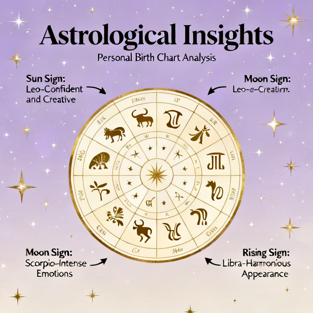 - Analyse der Hauptfaktoren: Sonnenzeichen, Aszendent, Mondzeichen und Häuser werden interpretiert.